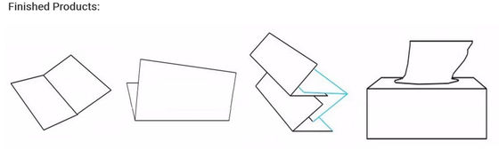 تدفق عمل آلة صنع مناديل الوجه: يتم قطع لفات الجامبو التي تم قطعها إلى العرض المطلوب بواسطة أسطوانات القطع ، ثم يتم طيها في صفائح مناديل الوجه المستطيلة المتداخلة.